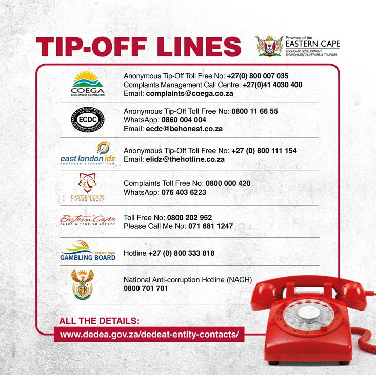 Parents, civil society, community leaders and members of the community are urged to be on the lookout for the movements and whereabouts of children during this time and where these parties are suspected they must be reported to the nearest police station or the Eastern Cape Liquor Board by calling Toll-Free Line 080 000 0420 or sending a WhatsApp message to 076 403 6223.